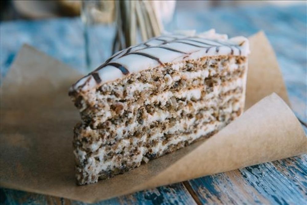 Торт "Эстерхази"- это изысканные миндальные коржи, пропитанные нежнейшим сливочно-ореховым кремом — утонченное наслаждение в каждом кусочке. Рекомендуем с чашкой капучино, чёрным чаем или классическим эспрессо.