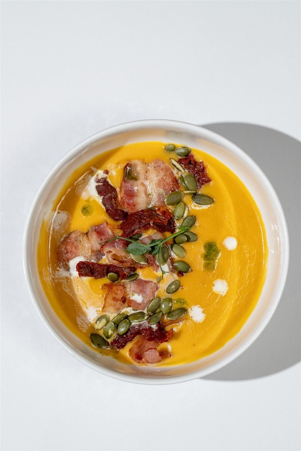 Нежнейший тыквенный крем-суп с добавлением бекона и вяленых томатов. Безусловный хит этой осени.