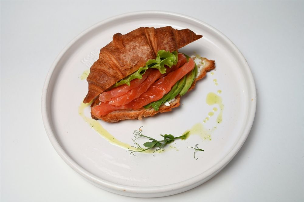 Круассан на сливочном масле с авокадо, микссалатом и слабосолёным лососем собственного приготовления
