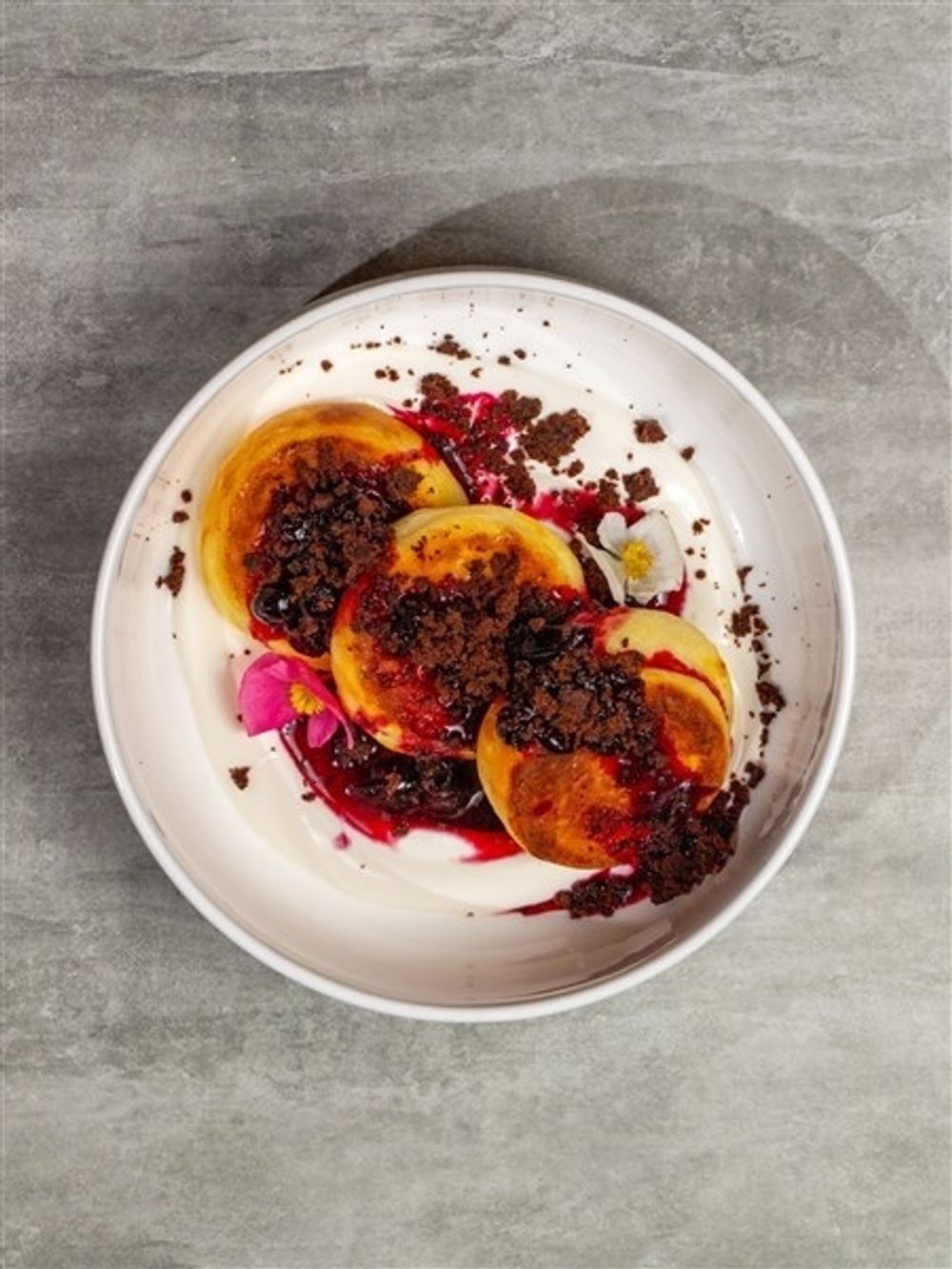 Сырники с джемом из чёрной смородины и крошкой из брауни