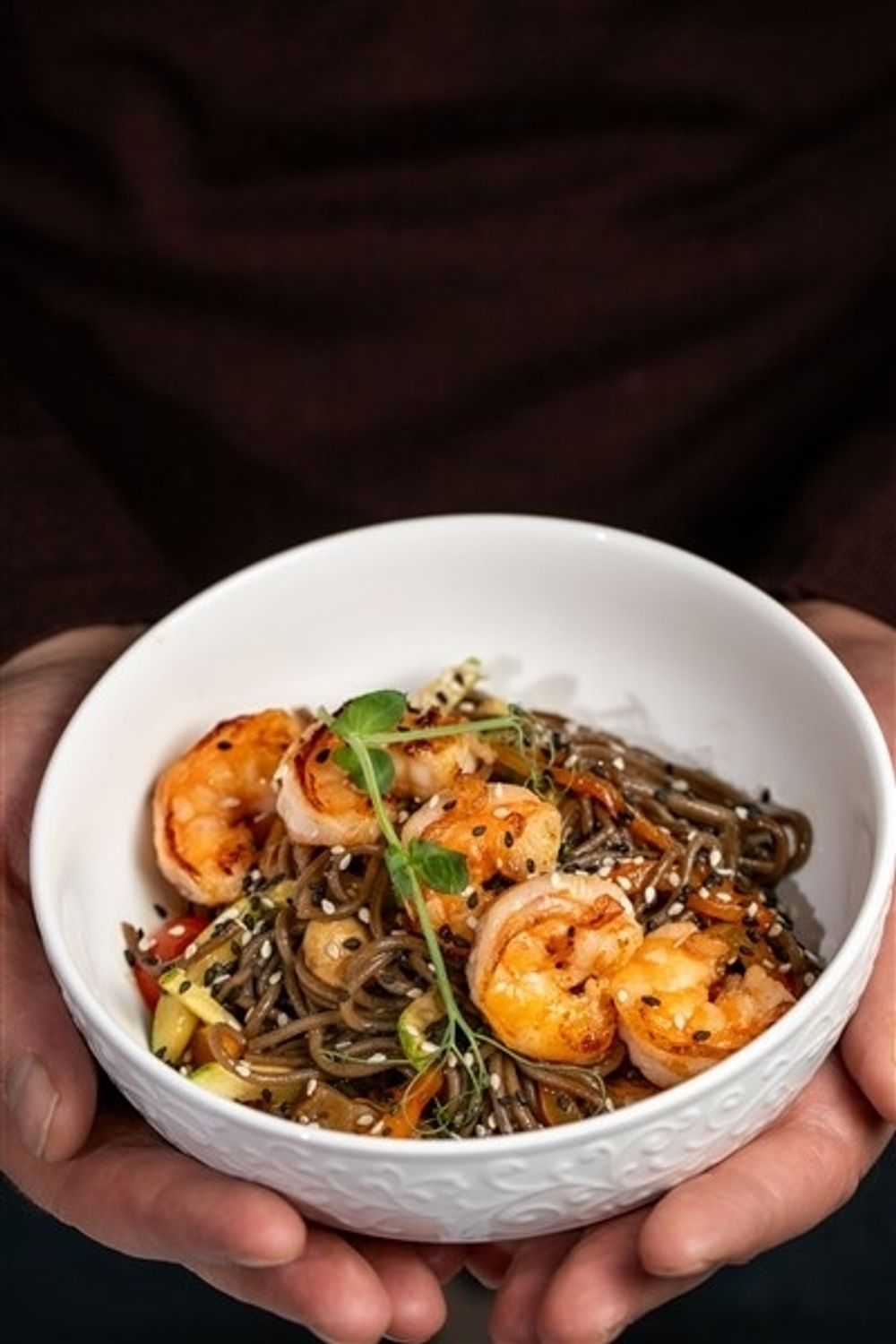 Гречневая лапша с креветками, шампиньонами, цукини, томатами черри и соусом терияки