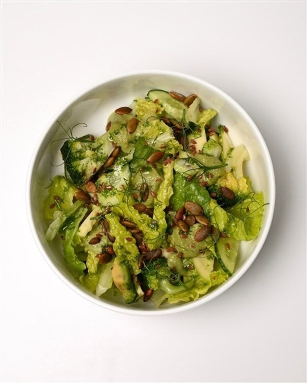 Зеленый салат, в составе: цуккини, огурец, брокколи, фенхель, авокадо, микс семян. Заправка кешью-крем