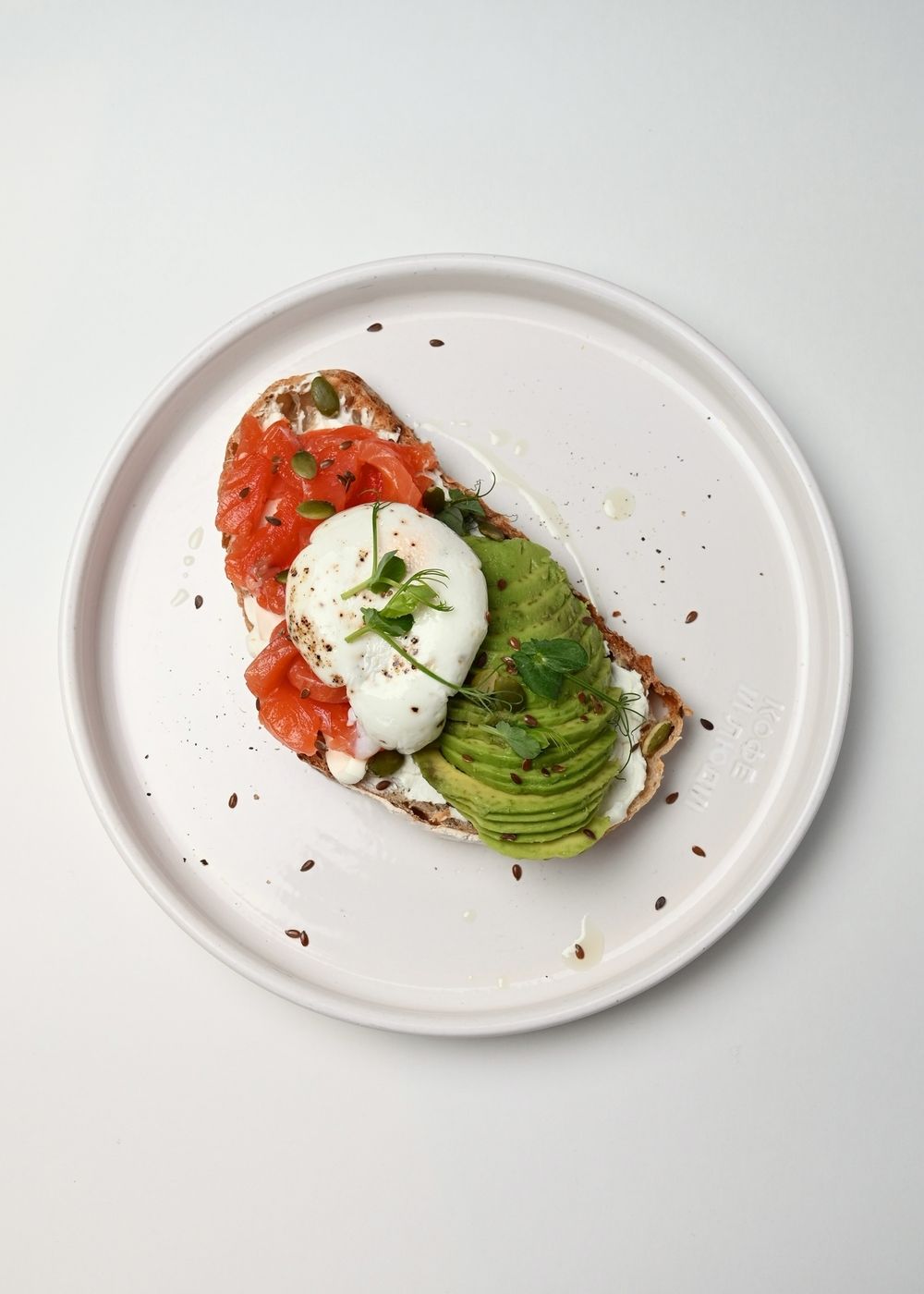 Авокадо-тост с лососем слабой соли собственного приготовления, творожным сыром, авокадо и цельнозерновым хлебом. Настоящий healthy food.