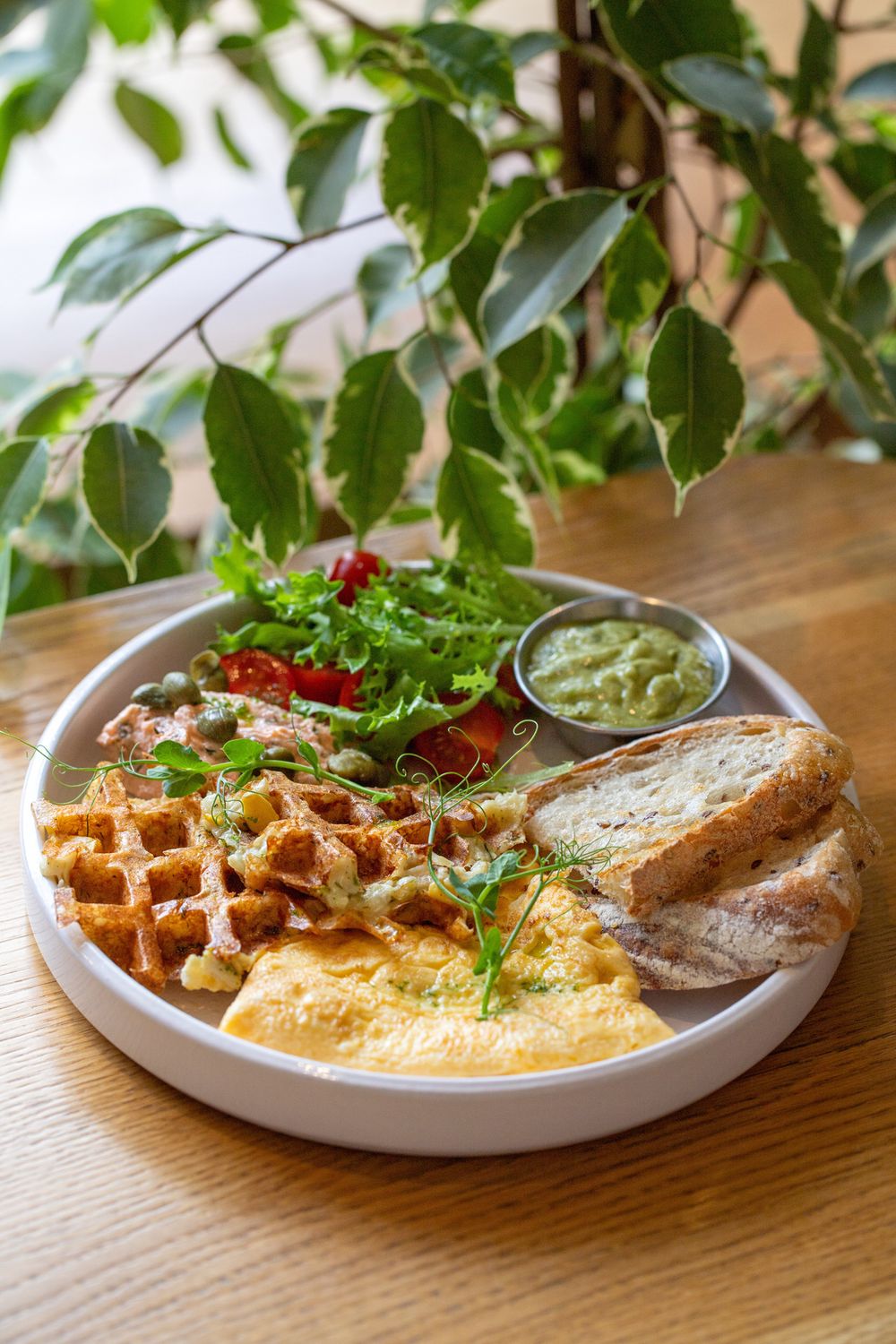 Наш фирменный завтрак "Кофе и Люди" (2 яйца (глазунья, скрембл или омлет), гуакамоле, риет из лосося, томаты черри, микссалата, хлеб цельнозерновой, вафли из цветной капусты)